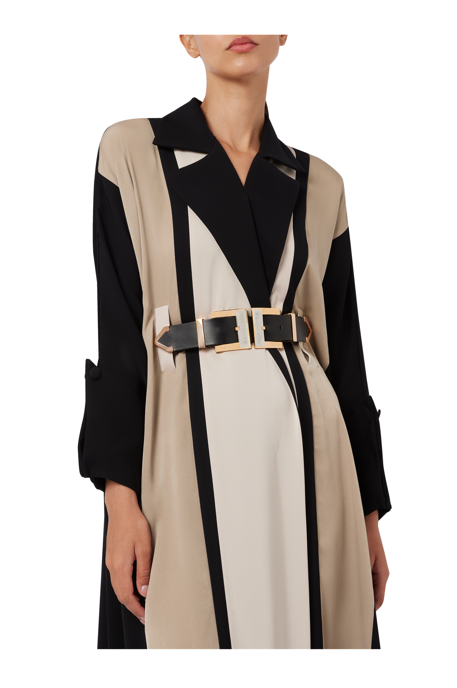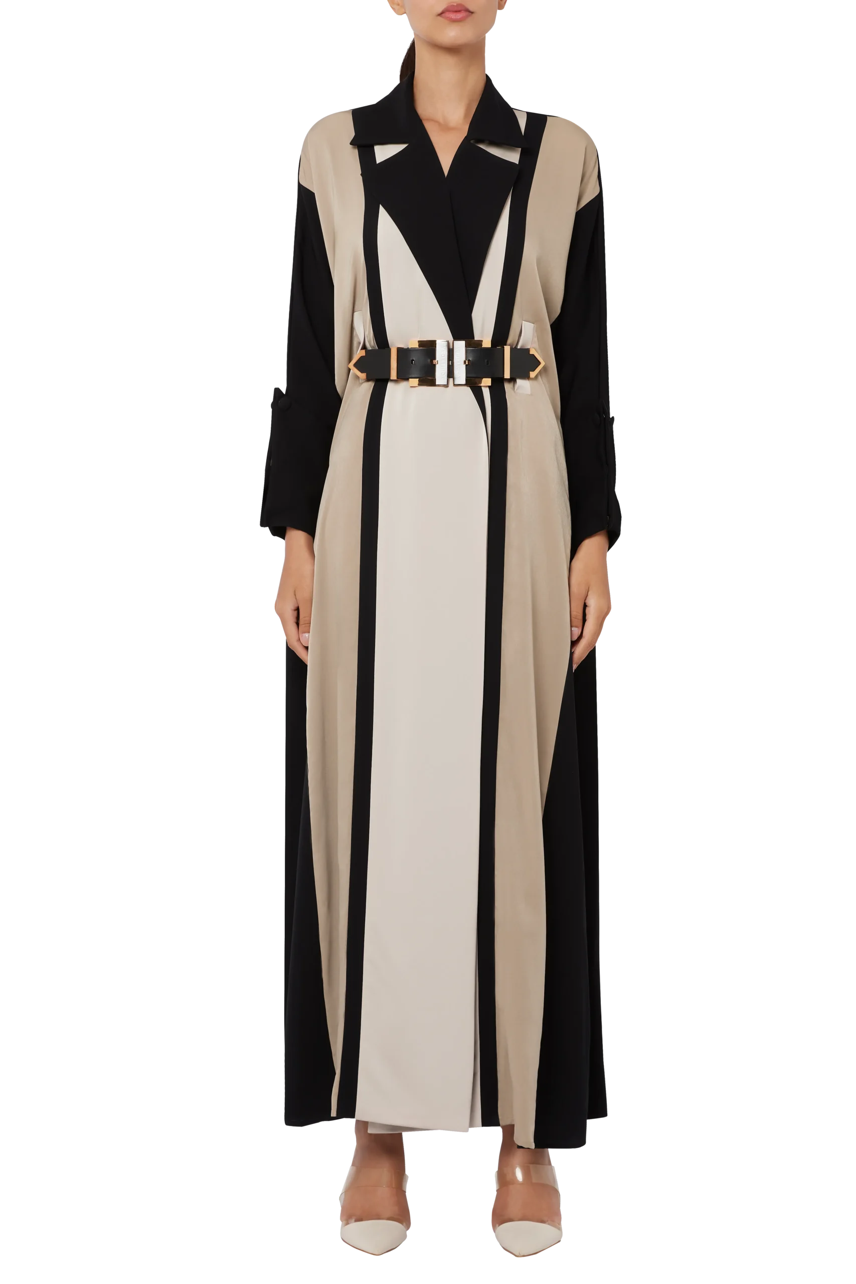 Presenting the very heart of this collection, our Courage Abaya. Fashioned from the finest polyester that brings together a stunning union of ivory, beige and jet black, featuring a luxurious metallic belt (sold separately) made to serve as the centre of the trench style abaya against the competing backdrop of beige, ivory and black along with uniquely shaped buttoned cuffs. Whether its formal events or that most important meeting of your life, the courage abaya may just bring out the bold and daring side of you.