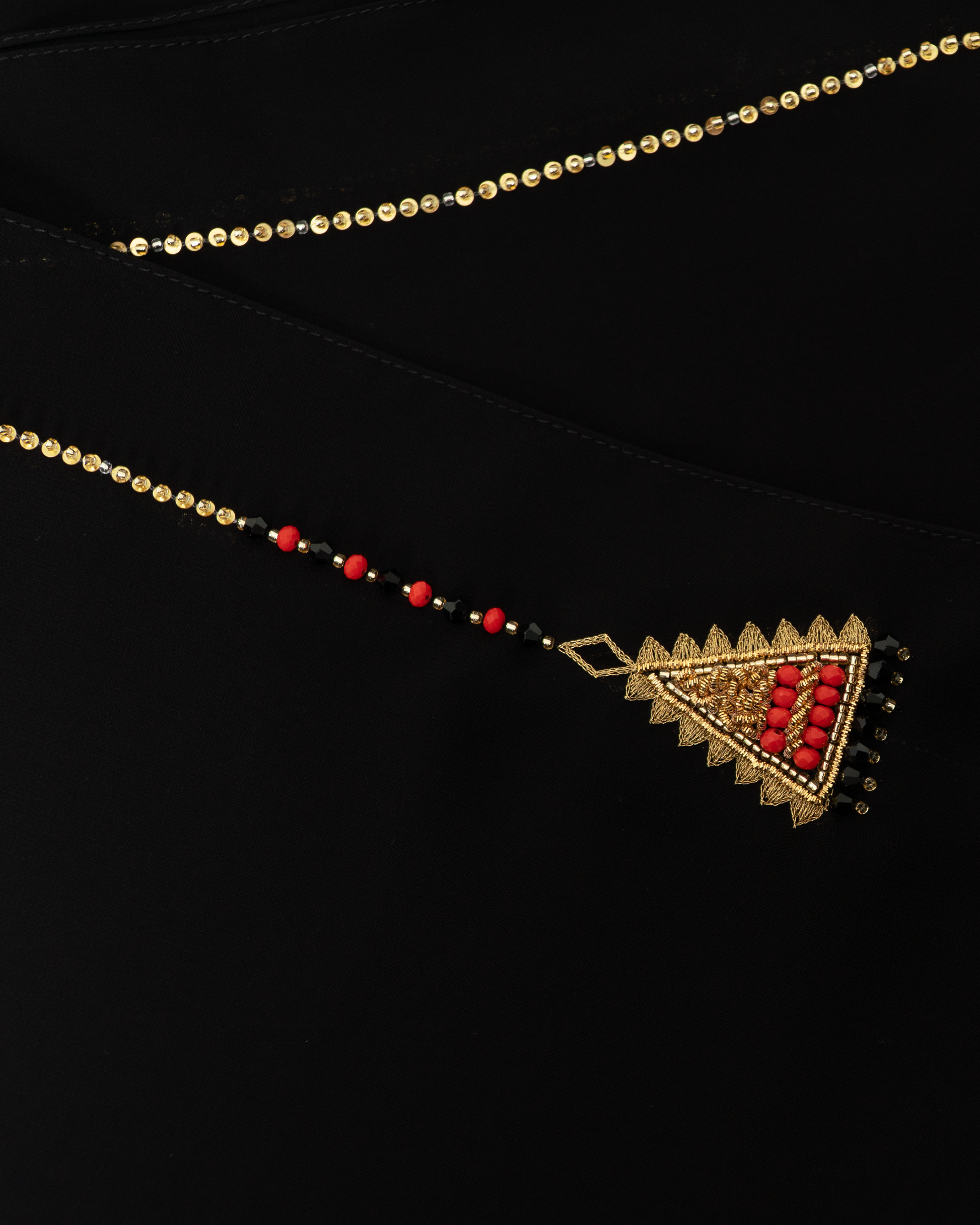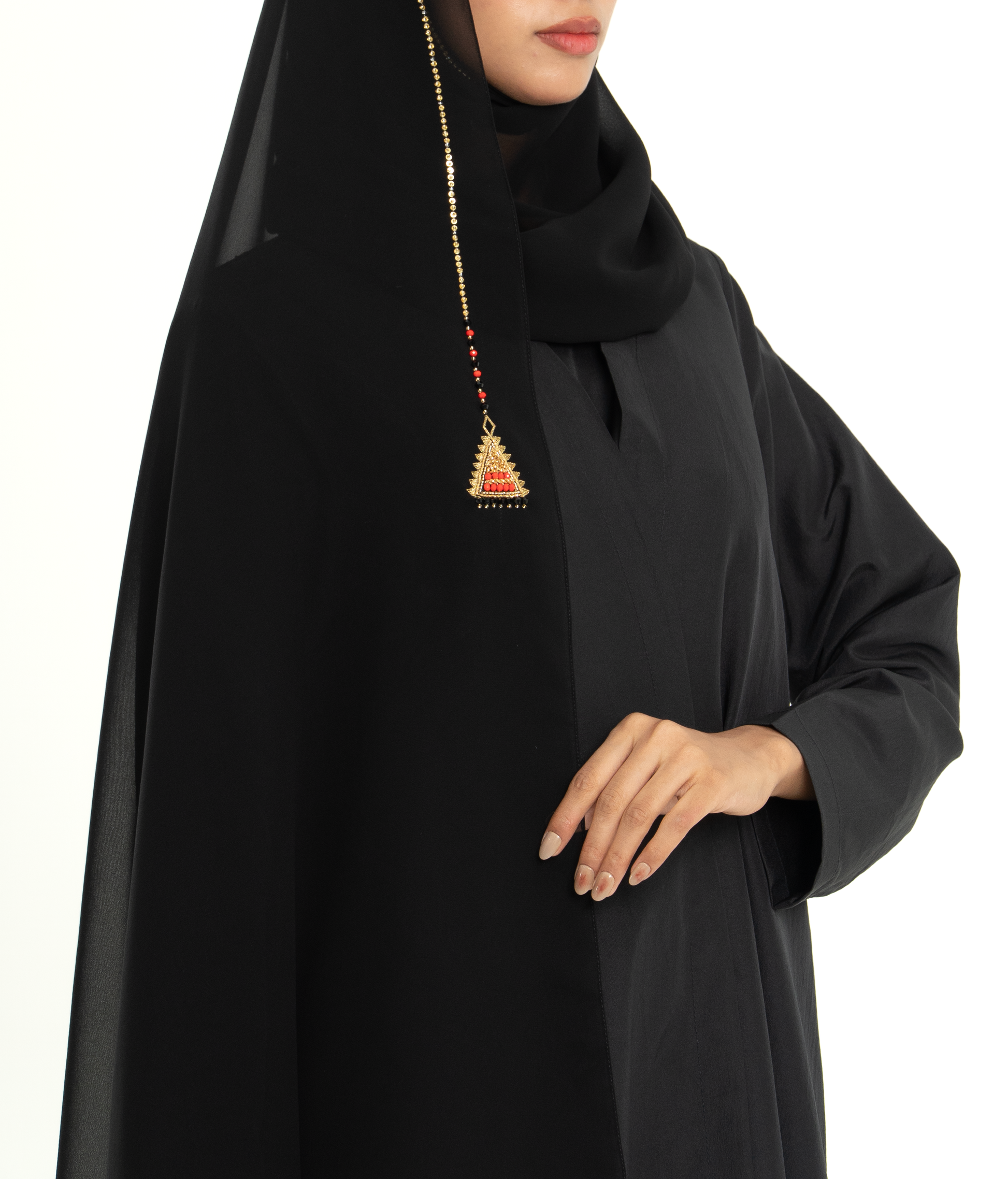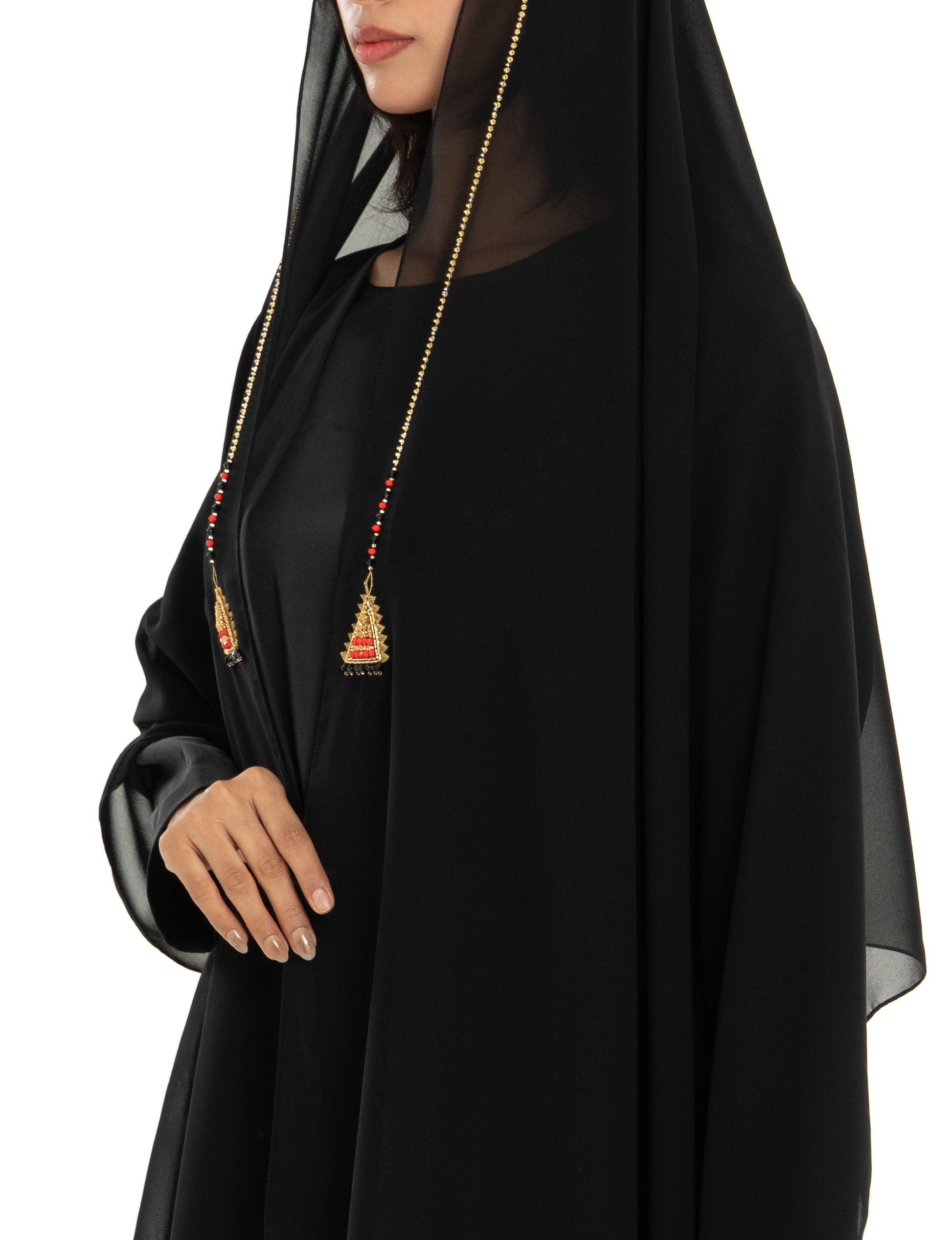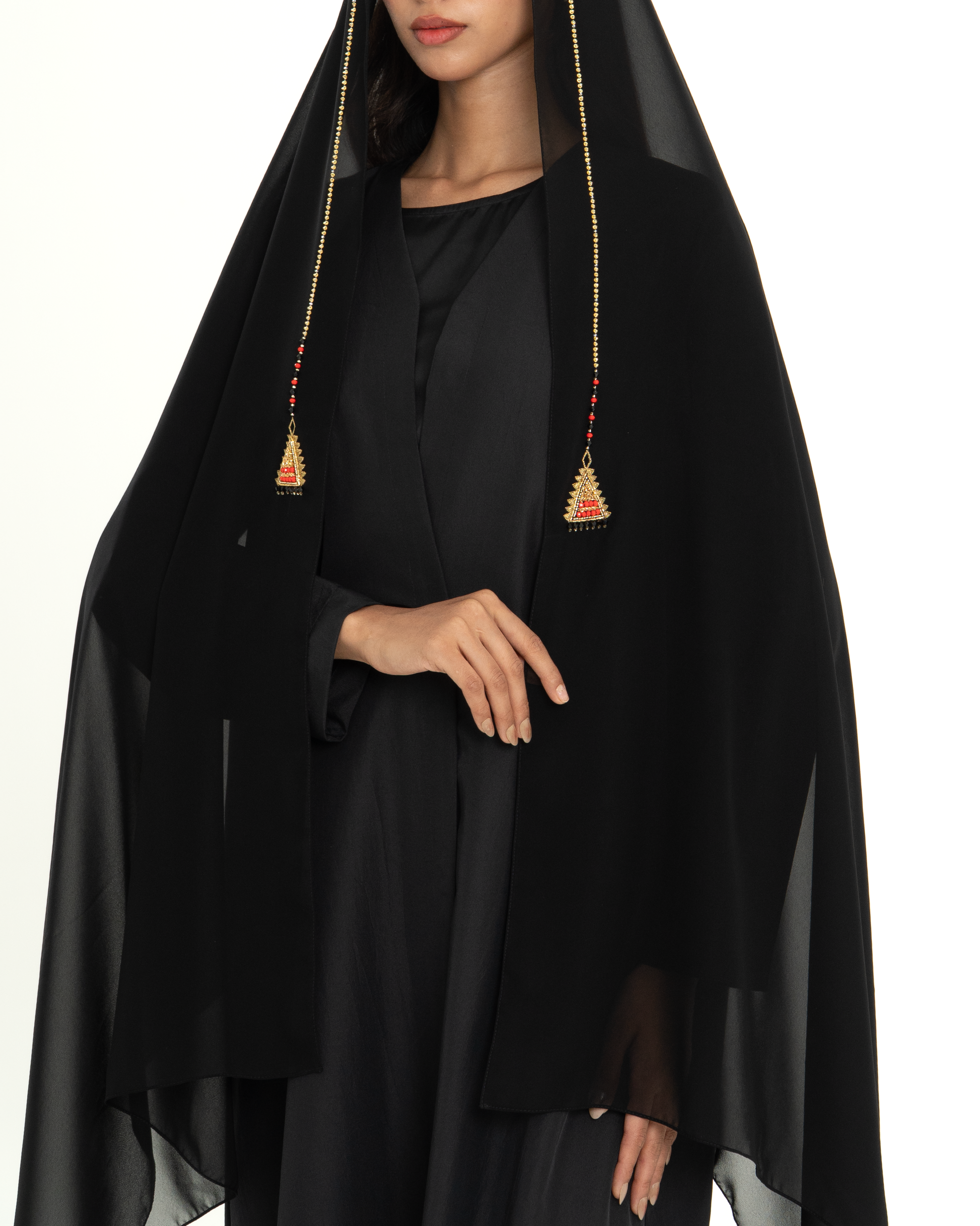 Crafted from premium chiffon, this sophisticated black Sheila features exquisite gold embellishments, each handcrafted. Inspired by the intricate artistry of Omani traditional jewelry, it beautifully combines cultural heritage with modern elegance. Its lightweight, flowing fabric ensures effortless drape and comfort, making it a timeless piece for special occasions.