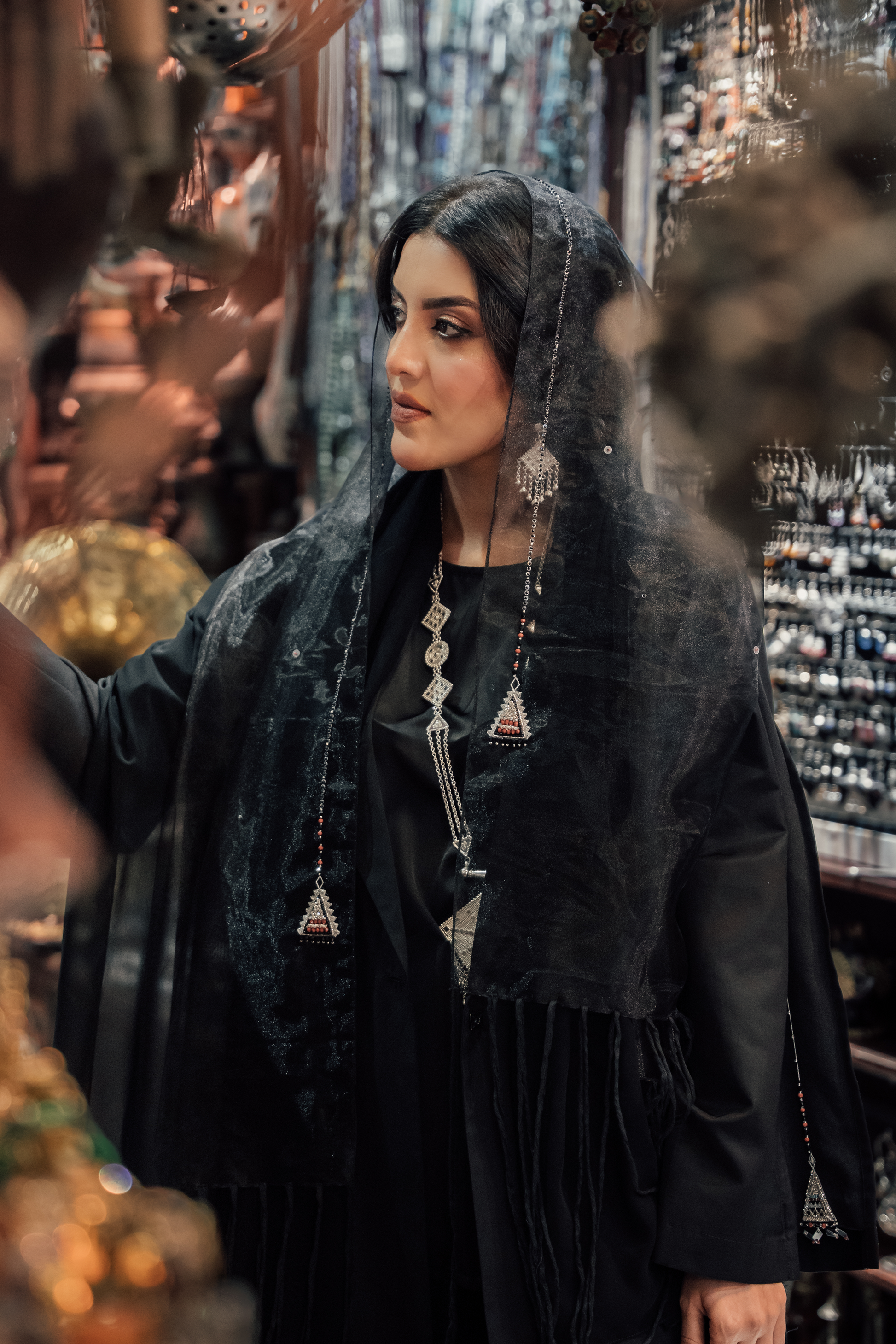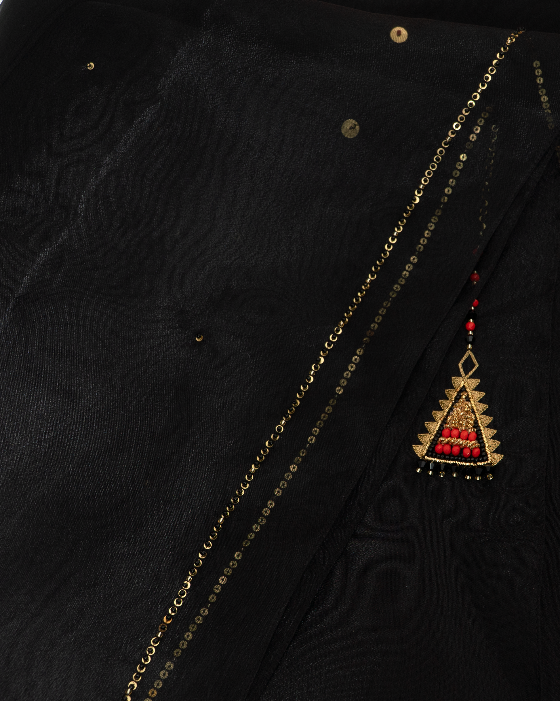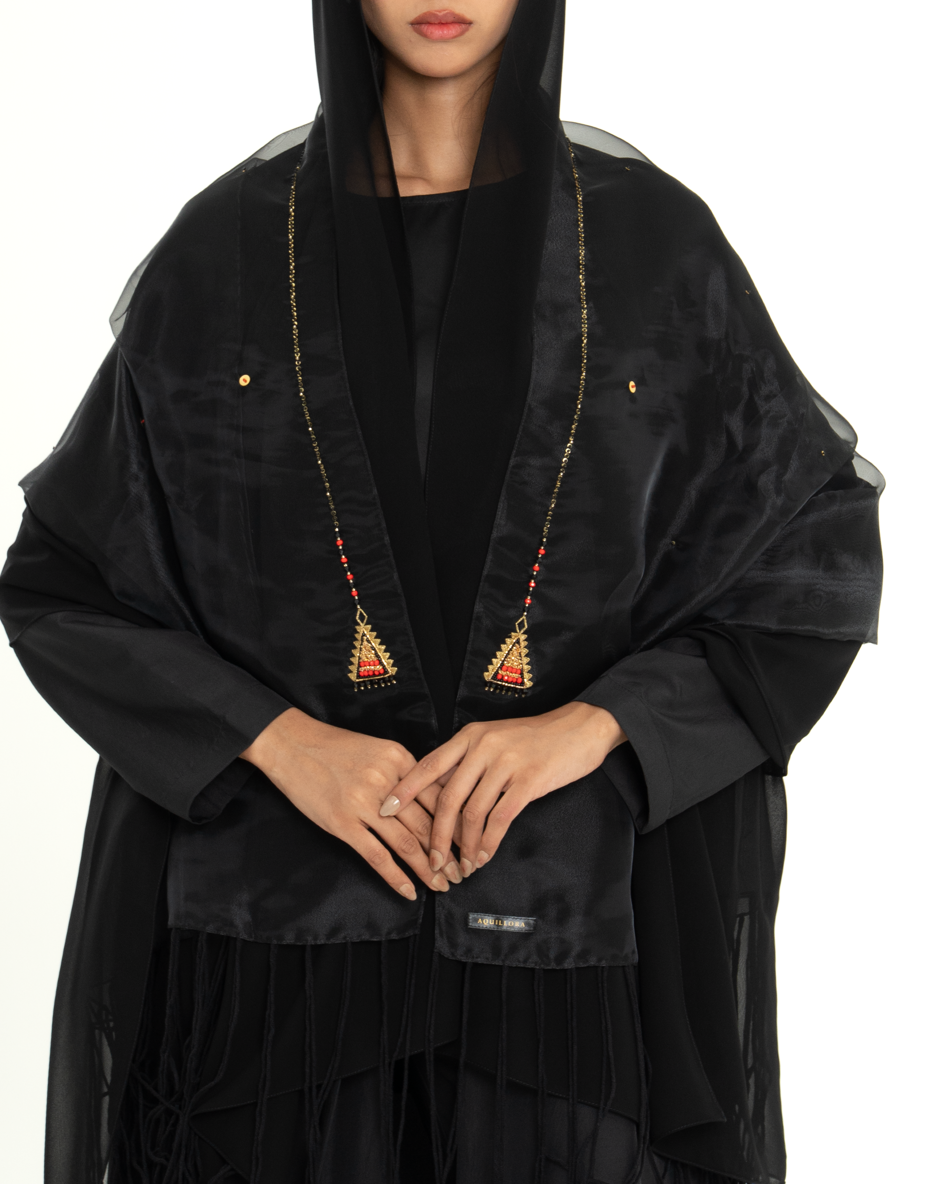 Elegant black chiffon and organza Sheila with handmade gold embellishments, inspired by Omani traditional jewelry. A perfect blend of heritage and modern sophistication.