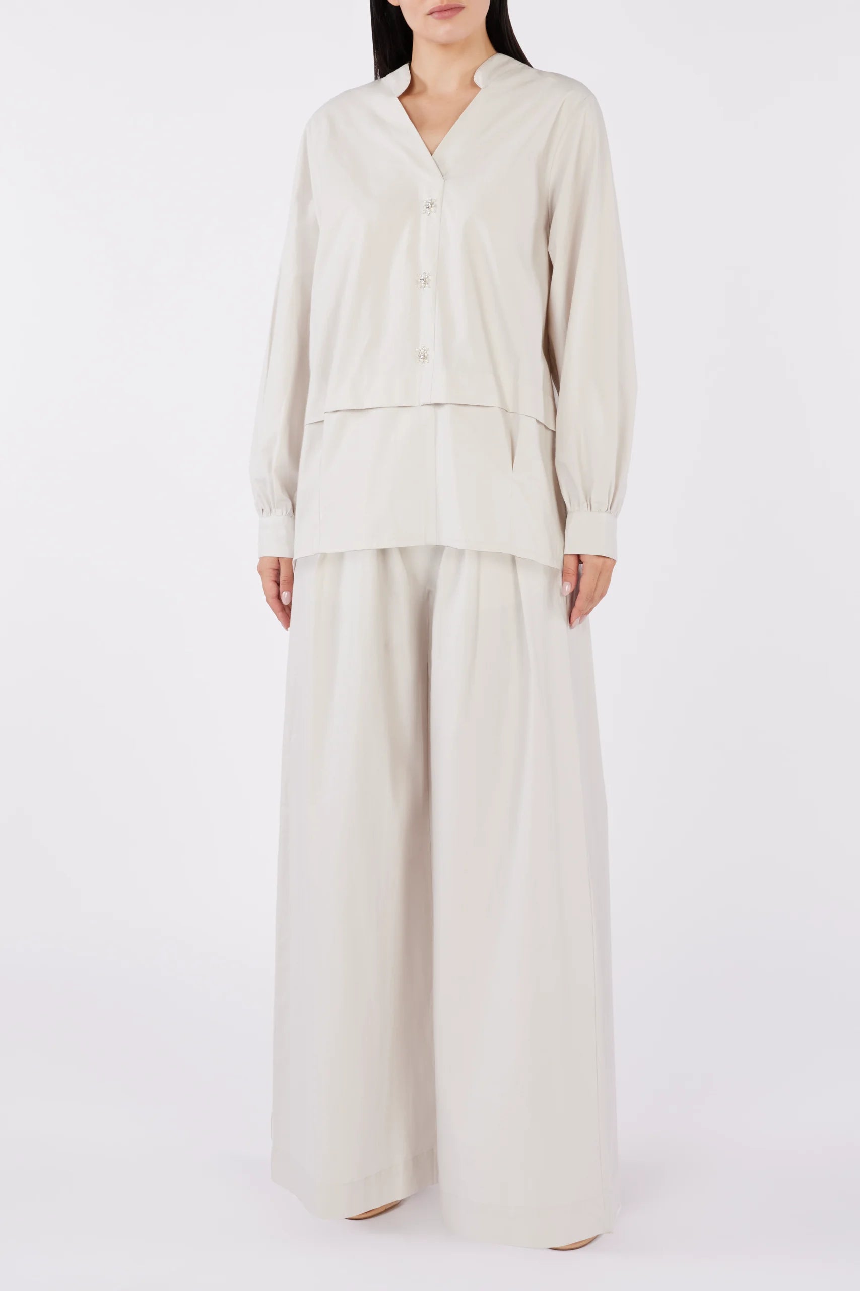 Let your guard down and take in the pleasure of enjoying rewards earned with our Indulgence V-Neck Shirt with a simple crystal and pearl embellishment. A strikingly modern cotton shirt in a most comfortable relaxed fit, boasting a bold collared V-Neck and sophisticated cuffed sleeves bearing two glinting silver buttons engraved with the Aquillora logo. On the front, it proudly wears a work of pearl and crystal embellishments painstakingly done by the hands of our talent artisans, to lift your sartorial standing to great heights. Versatile enough to be worn with the matching pair of pants from Aquillora, or any of your choice, it holds its own in any setting.