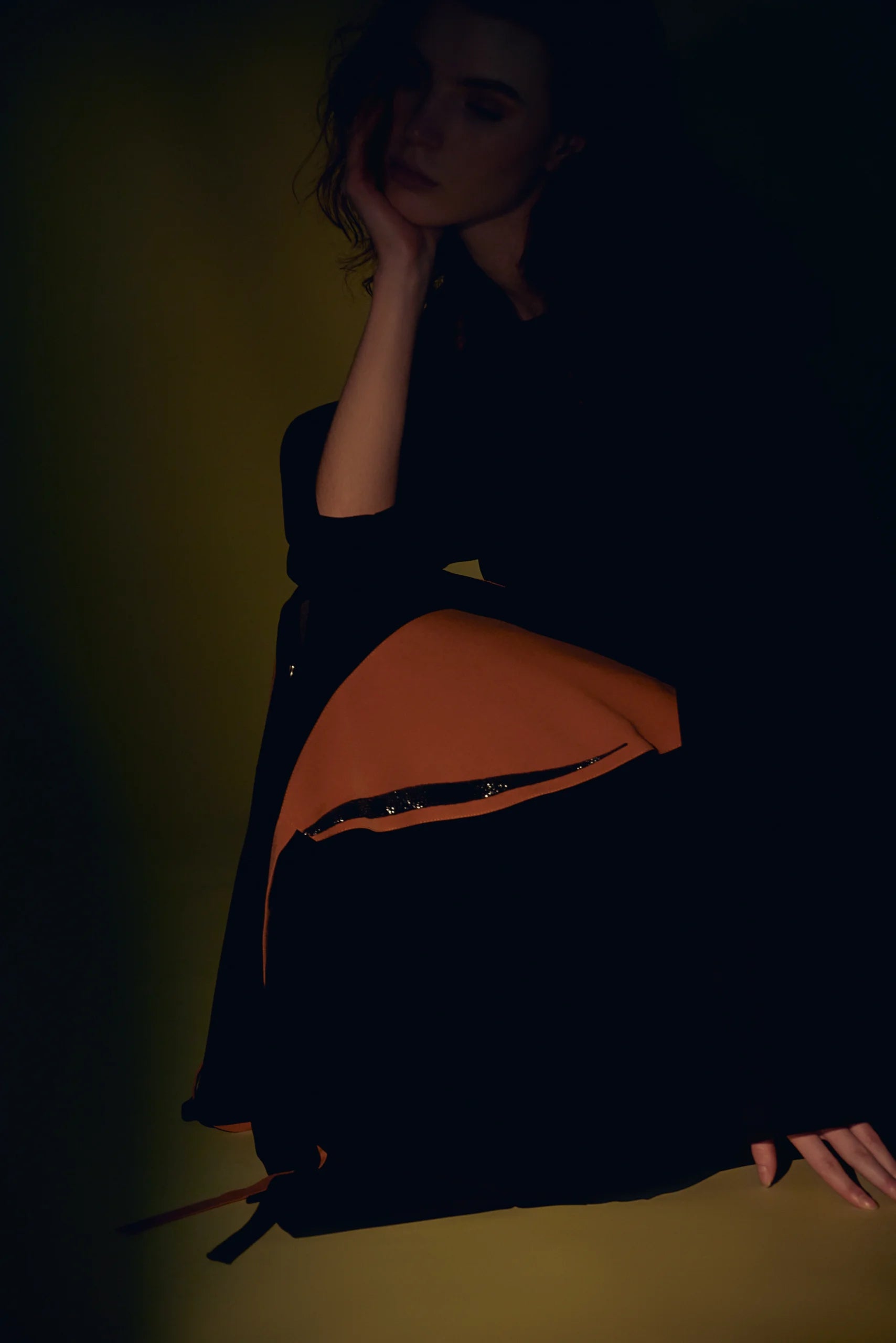 Let the power of human creativity and imagination realized drape you with our Power V-Neck Abaya. Crafted using a rich and alluring jet-black shade, it features a striking V neck, along with exaggerated front pockets in a contrasting shade (boasting black embellishments fashioned painstakingly with the use of thread work and black sequins by hand) that seamlessly flow to the bottom, so to make sure it never fails to catch the eyes of beholders, witting and unwitting.