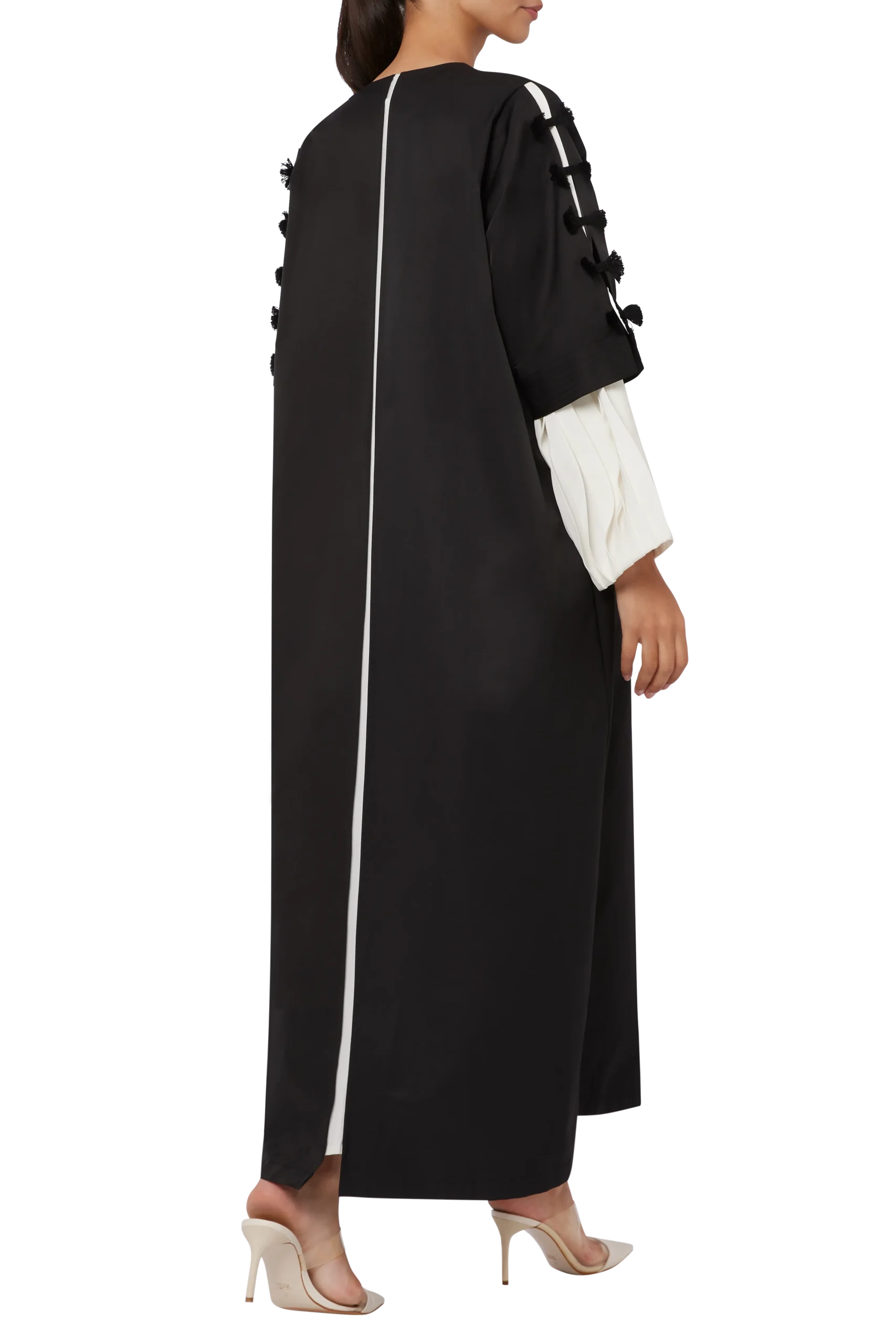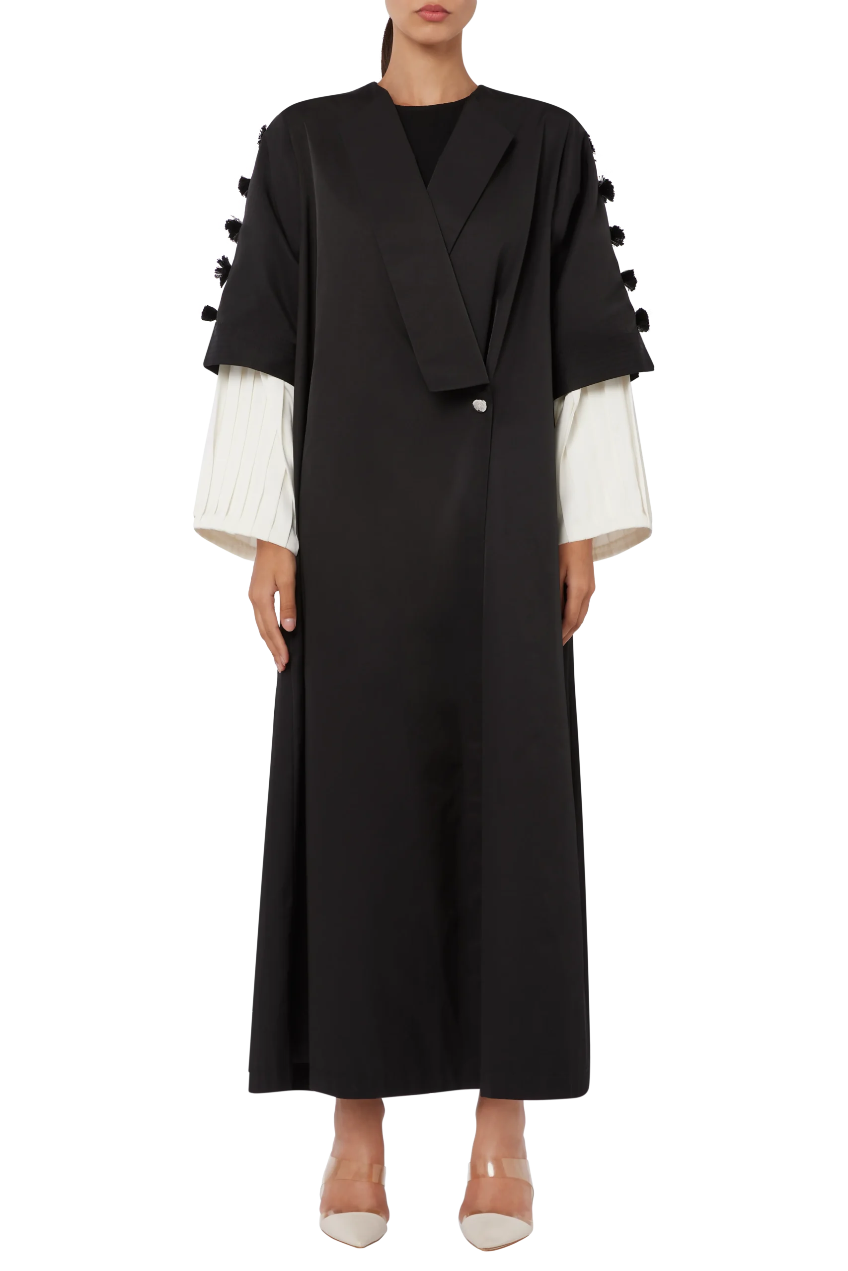 As the last stage of this journey of courage, we present the Serenity Abaya. A mystical design of au courant modish black, radiating timeless sophistication, it features a solid stretched collar tapered to one end by a gleamy button bearing the Aquillora logo (engraved), and standout sleeves, finished by pearly white vertical pleats. Thread like fringed tassels run through the centre of these magnificent sleeves, and its hemline is tailored for graceful comfort and sharp style. The fabric is constructed from high-grade cotton and polyester sourced from Japan.