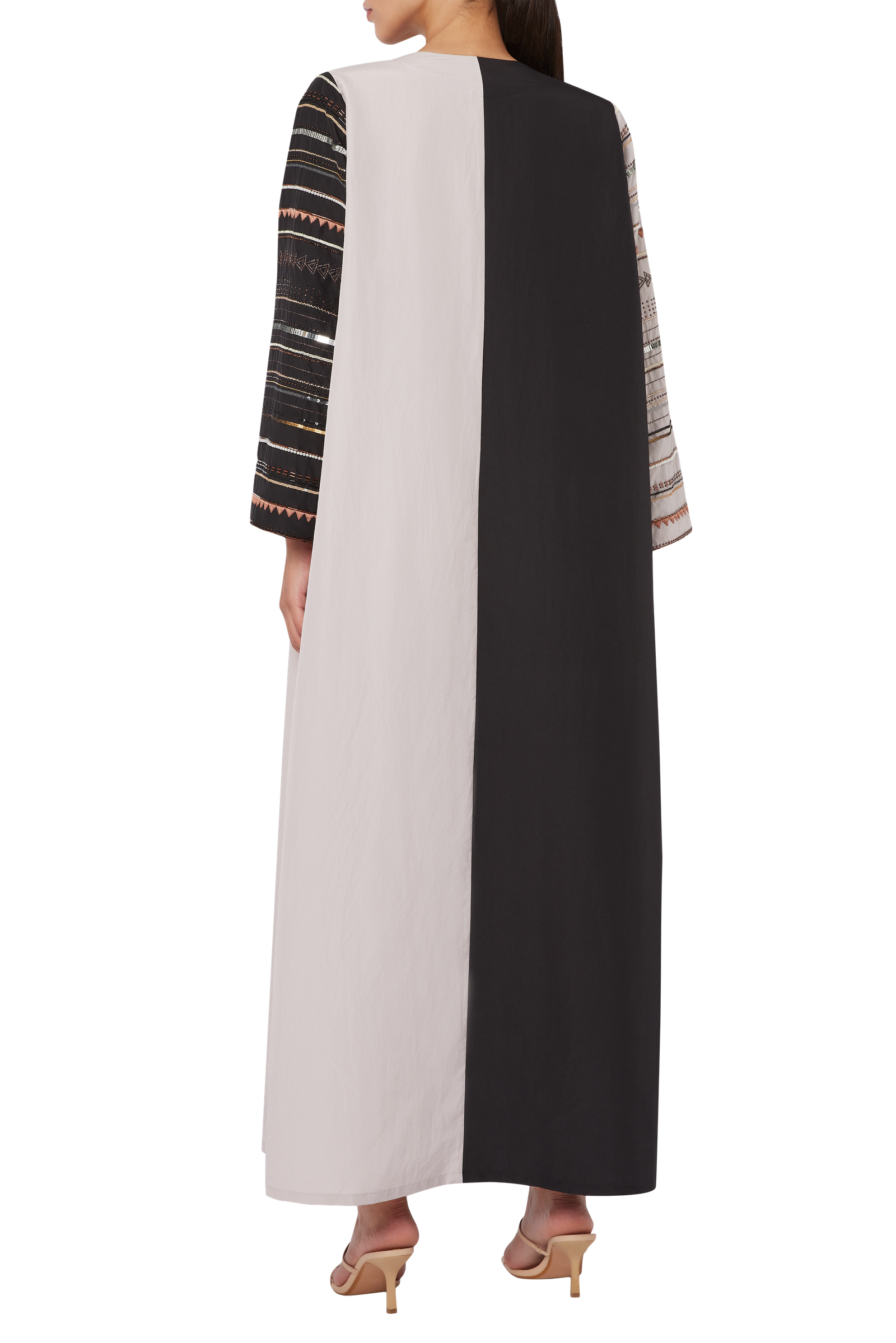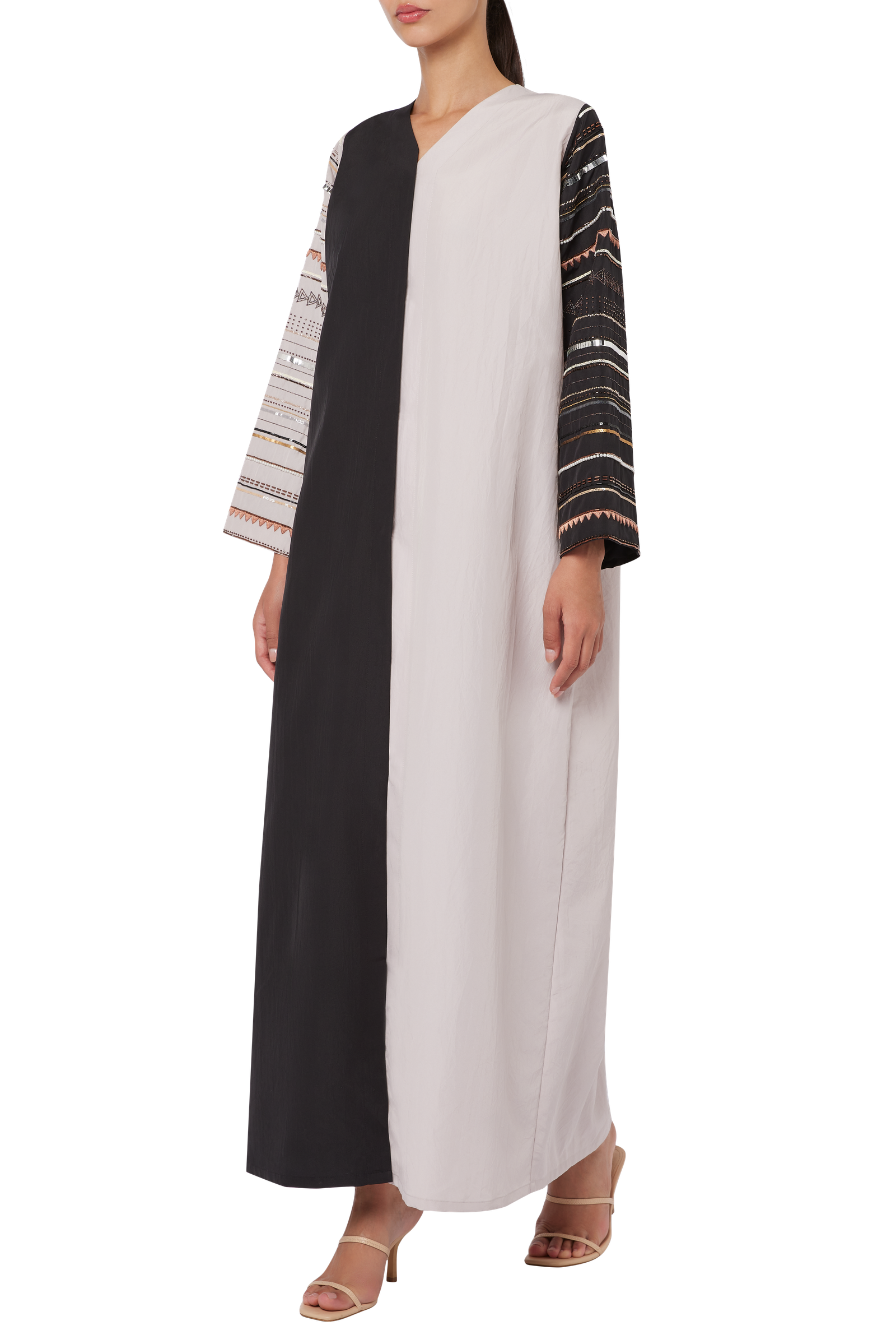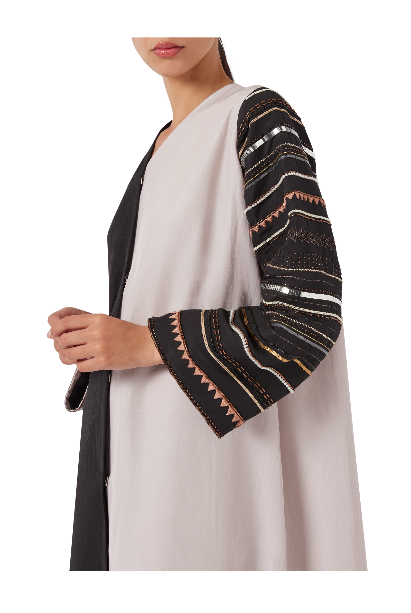 To weave and live out the tales of the boldest choices you have made in life, we present The Choice Abaya. Tailored to a relaxed fit and constructed with polyester sourced from Japan, the abaya flaunts a contrast of lavender and jet black with sleeves adorned by embellishment work (hand-placed) which is delicately sewn by hand into the fabric, radiating a sense of timeless opulence.