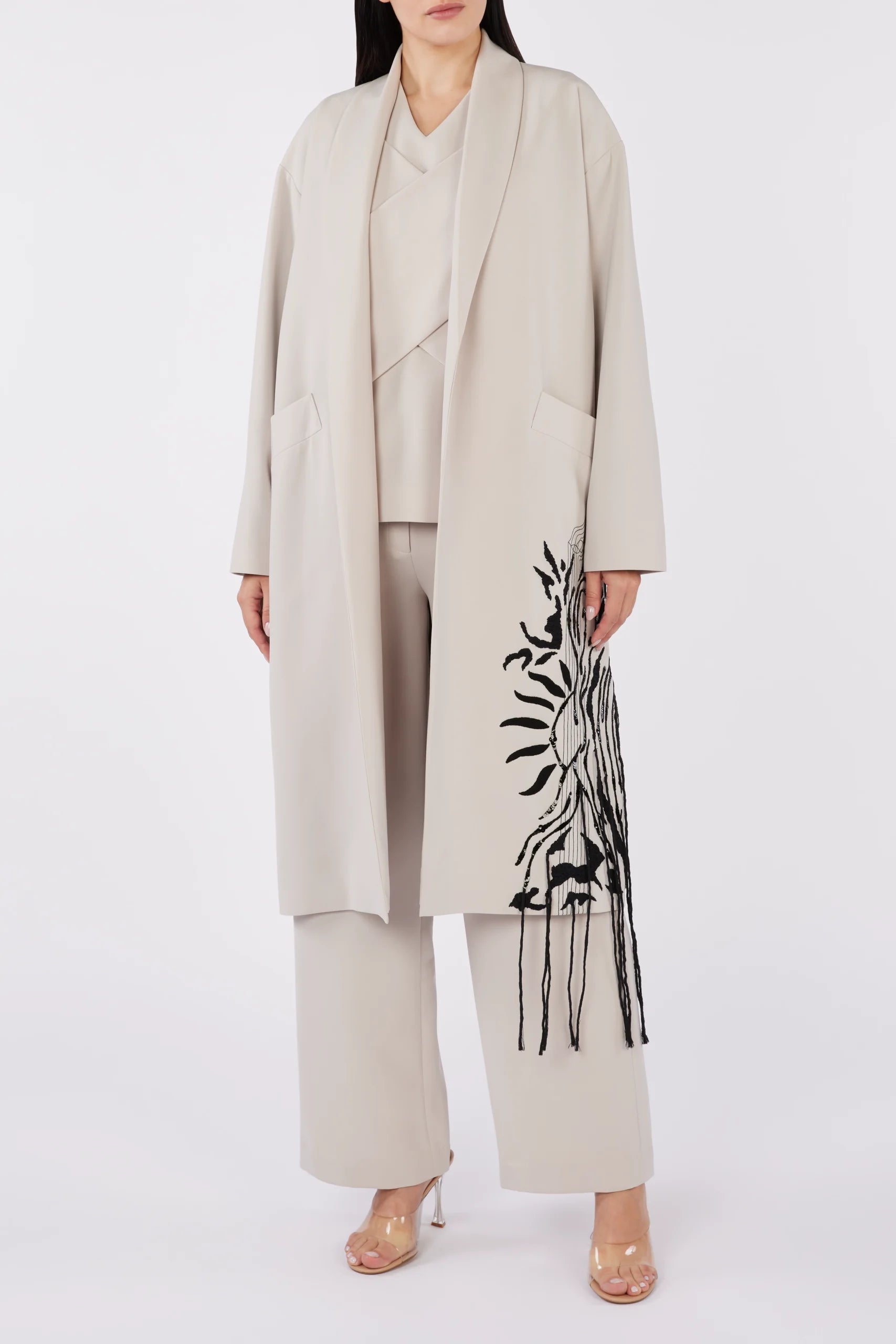 Presenting The Descending Coat: An artistic attempt to capture the experience of serene descent in all humility. A masterpiece crafted in a subtle beige shade, this stately coat features a modest shawl collar and spacious pockets on both sides. What elevates this design to another level is an intricately woven work of masterful hand embroidery and hand-sewn sequins from our talented artisans, which continues to flow and hang gracefully beyond the bottom of the coat.