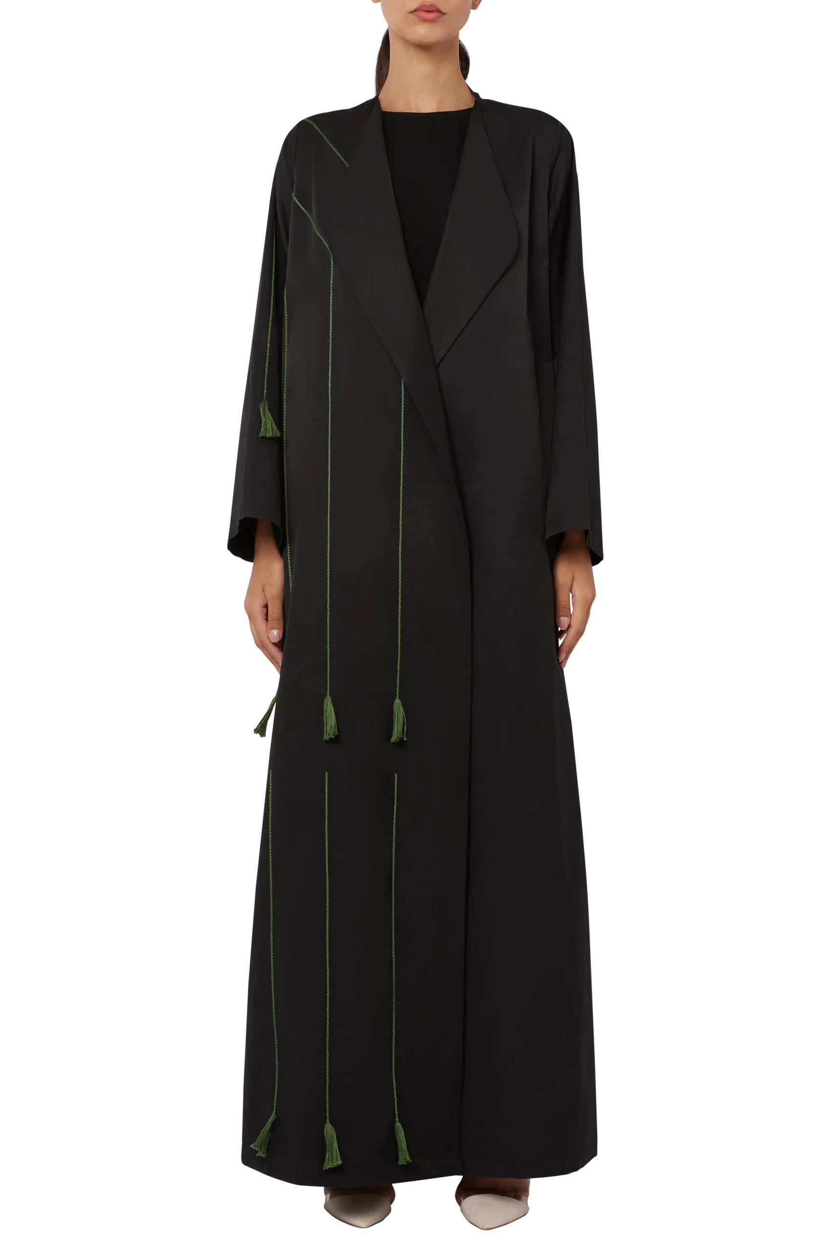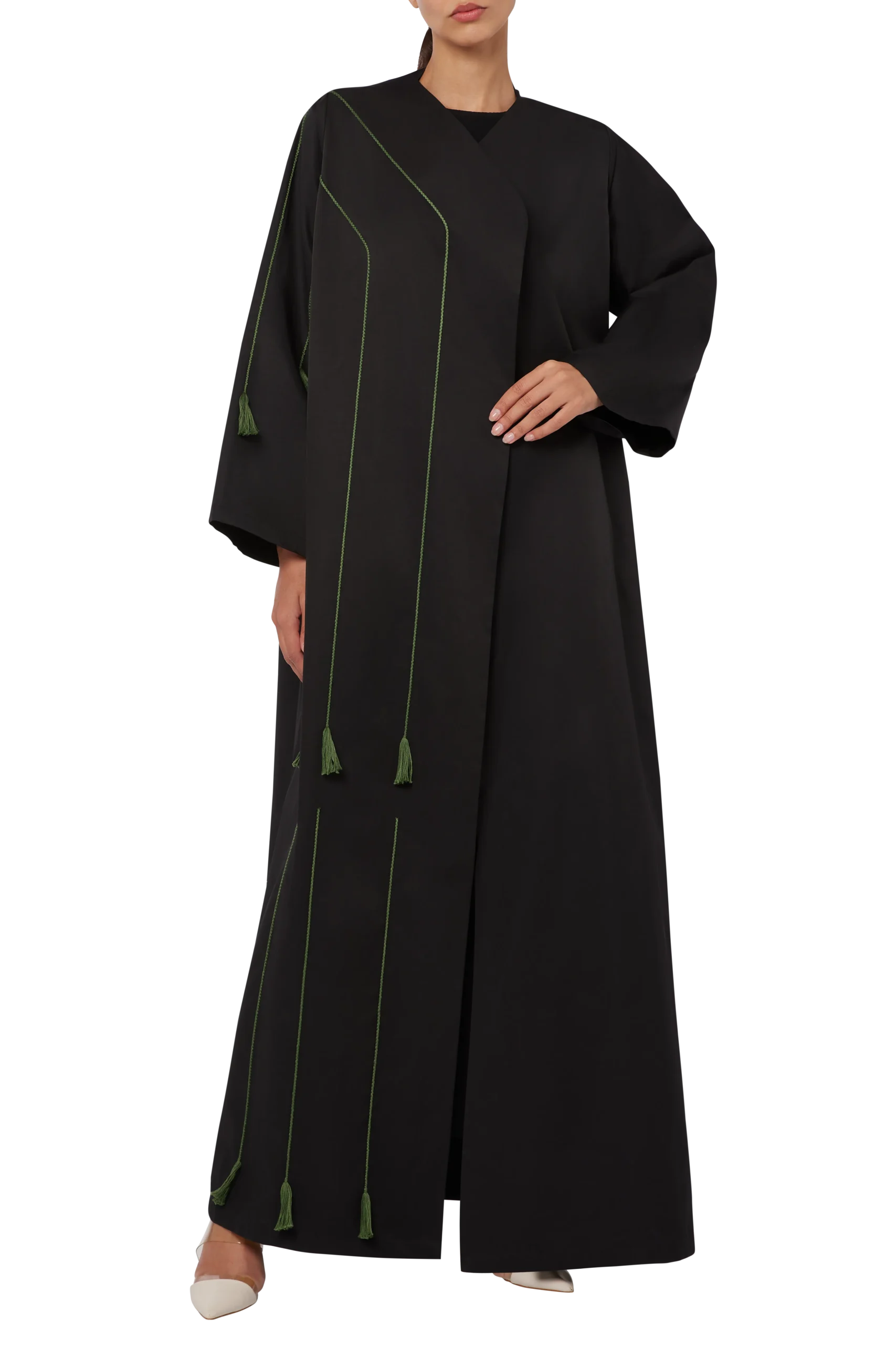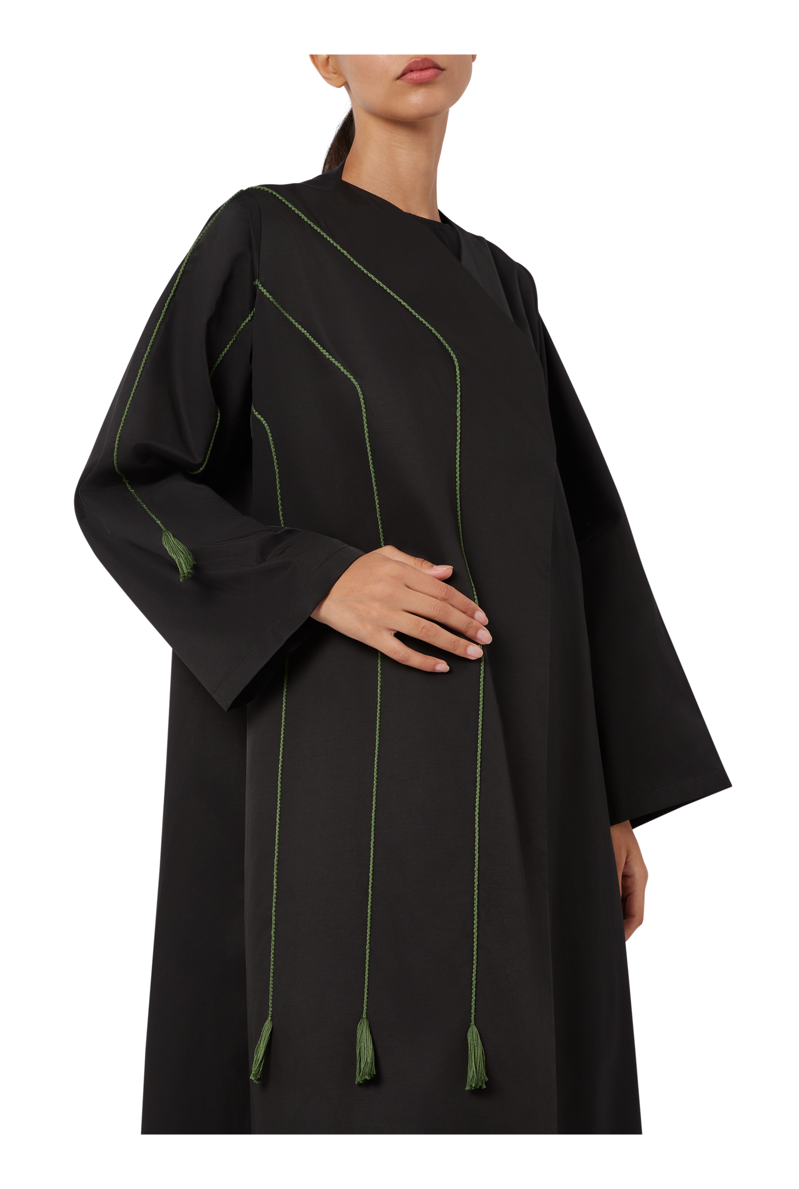 An ethereal and dark design stirring thoughts of the night’s eternal mystery, we present the Dispersion Abaya. Crafted using luxurious Japanese cotton and polyester, the black shade of this design is complimented with masterfully rendered hunter green lines along one side to accentuate its refined style, which are terminated towards the end by playful, fringed tassels giving it a touch of playfulness. A chic and accessible design, this can be your go to outfit for almost anything, for its mystical glamour and artistry can be appreciated by all.