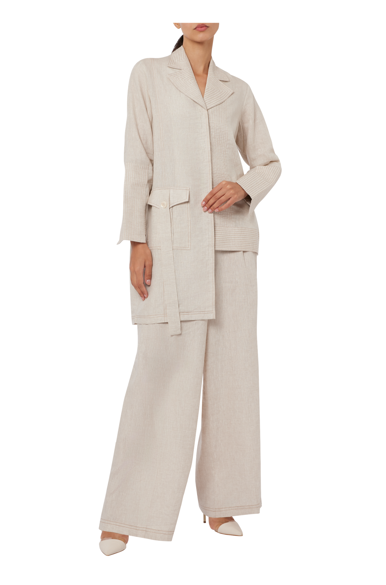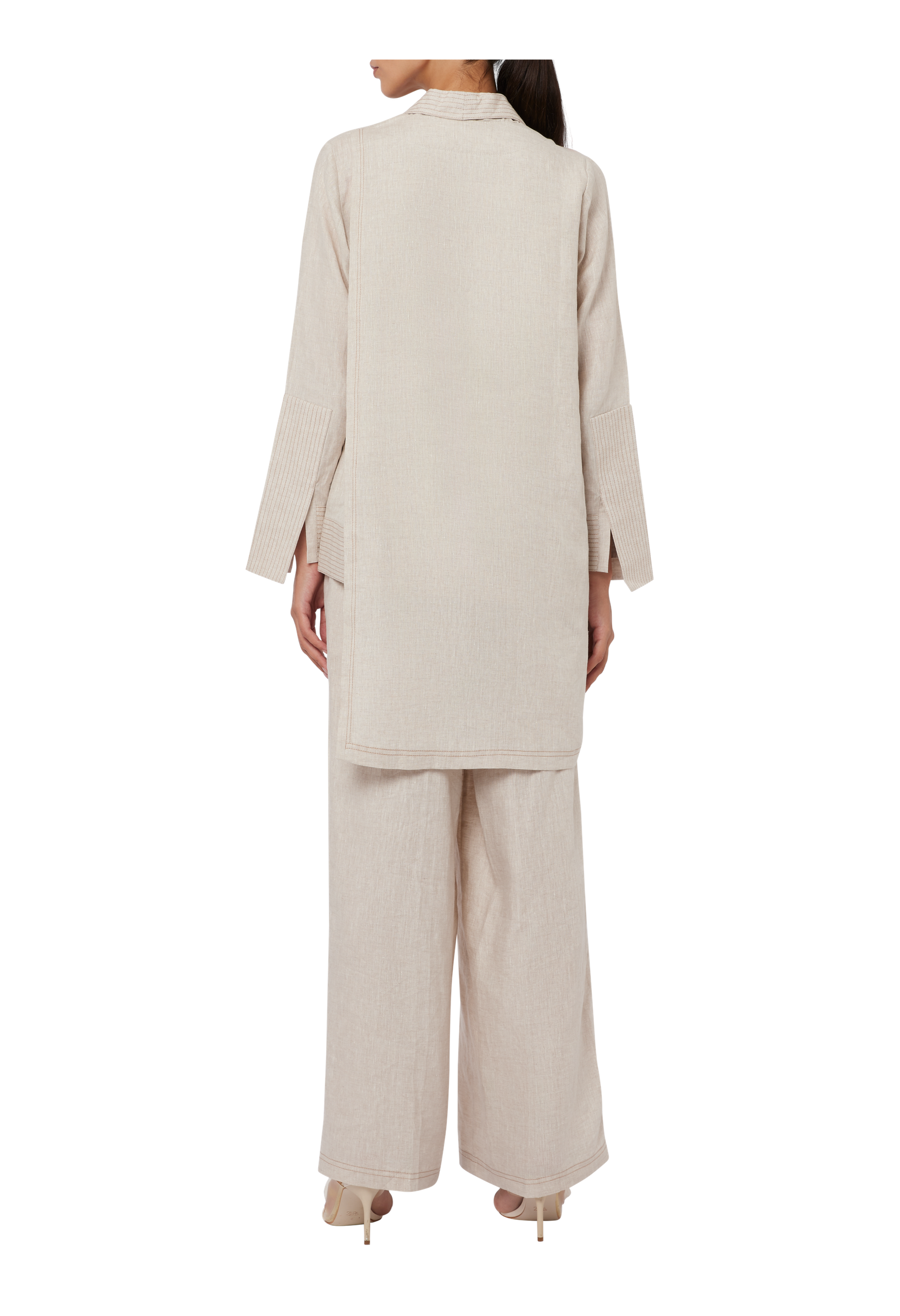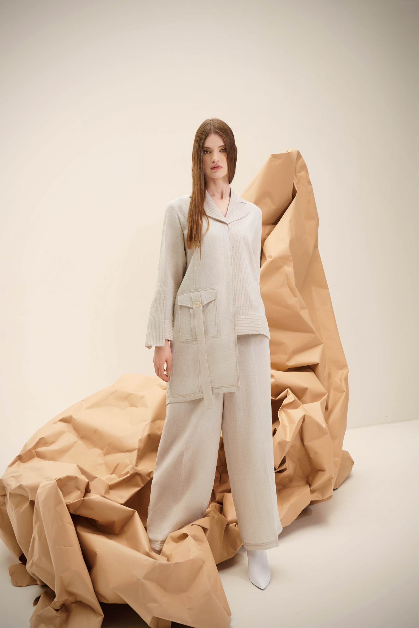 An exemplar of minimalistic elegance and grace, The Dispersion casual shirt and pants set, made of 100% Linen with its modern asymmetrical hemline and exquisite stripes along its borders, boasting a notch-lapel collar and buttoned pockets, is made for you to step up your style game without going overboard. When worn with our beautiful straight cut loose pants, this neutral beauty focuses on the essentials, symbolizing a sense of clarity and approaching calmness when all tensions are relieved.