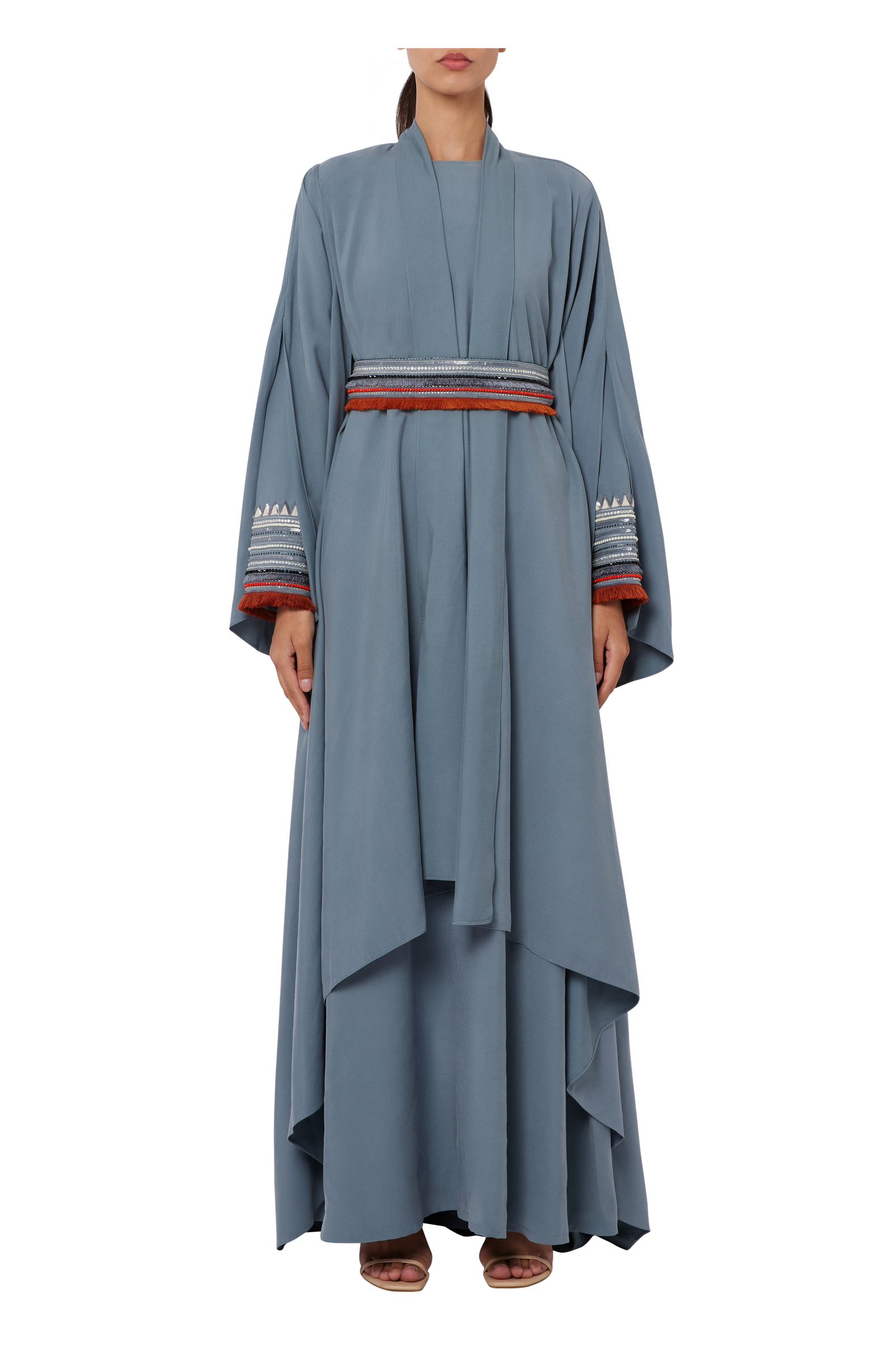 We present to you, The Dispersion Cape. Made to complement The Dispersion Dress, it is made of sumptuous cadet grey fabric and a fulvous orange highlighting its elements and conveys a sense of boundless eloquence. It comes with a thick fabric belt ornated by an exotic pattern of little beads, exquisite hand-embroidery and crystals.