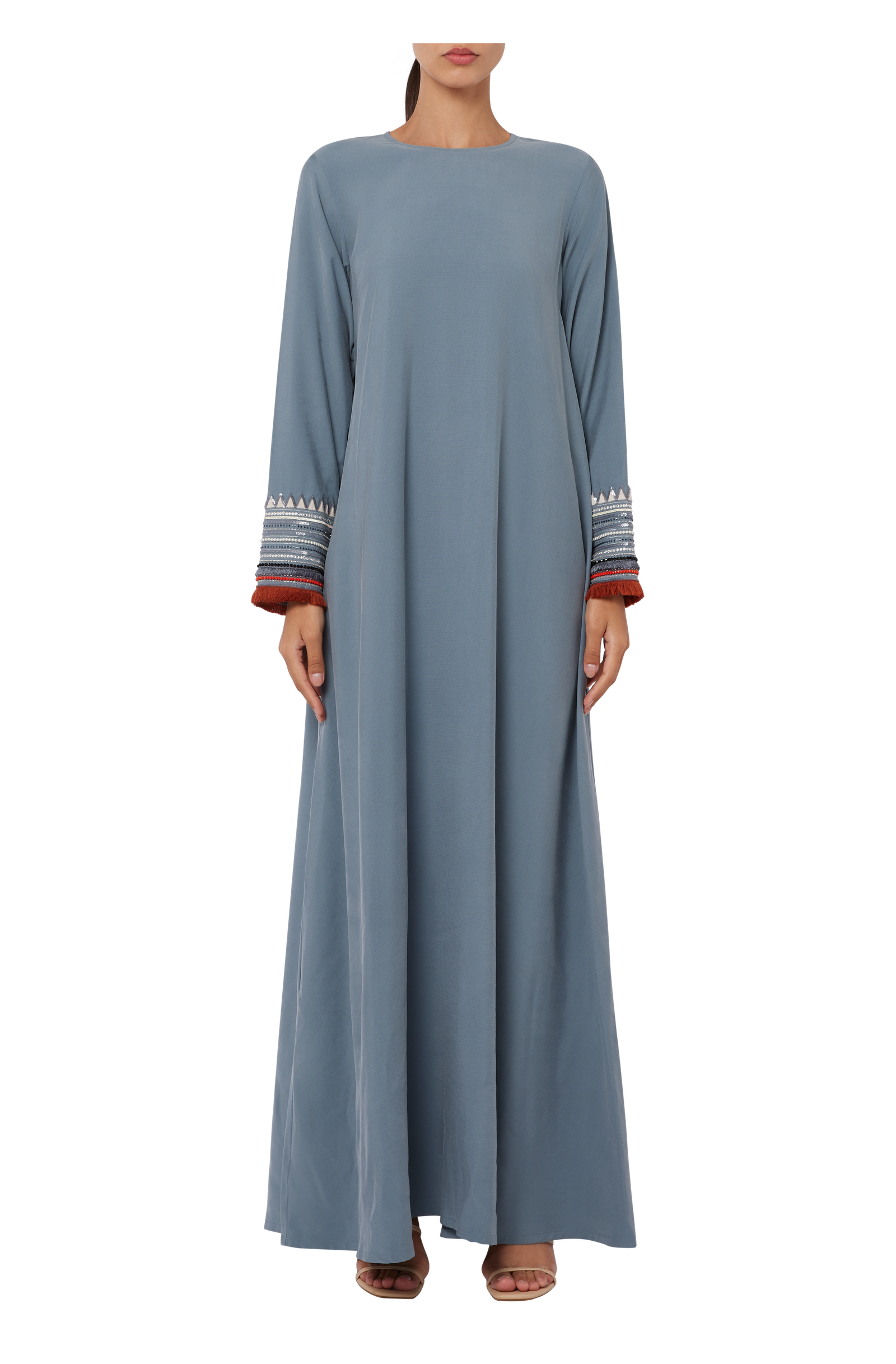 For the days you decide to be bold and put yourself out there, we present the Dispersion long dress. Constituted of a sumptuous cadet grey fabric and fulvous orange highlighting its elements, this long dress and its sleeves are cut into a flowing, unrestrained hemline to convey a sense of boundless eloquence. Add to that the sleeves which is ornated by an exotic pattern of little beads, hand-embroidery and crystals that end in fringed tassels.