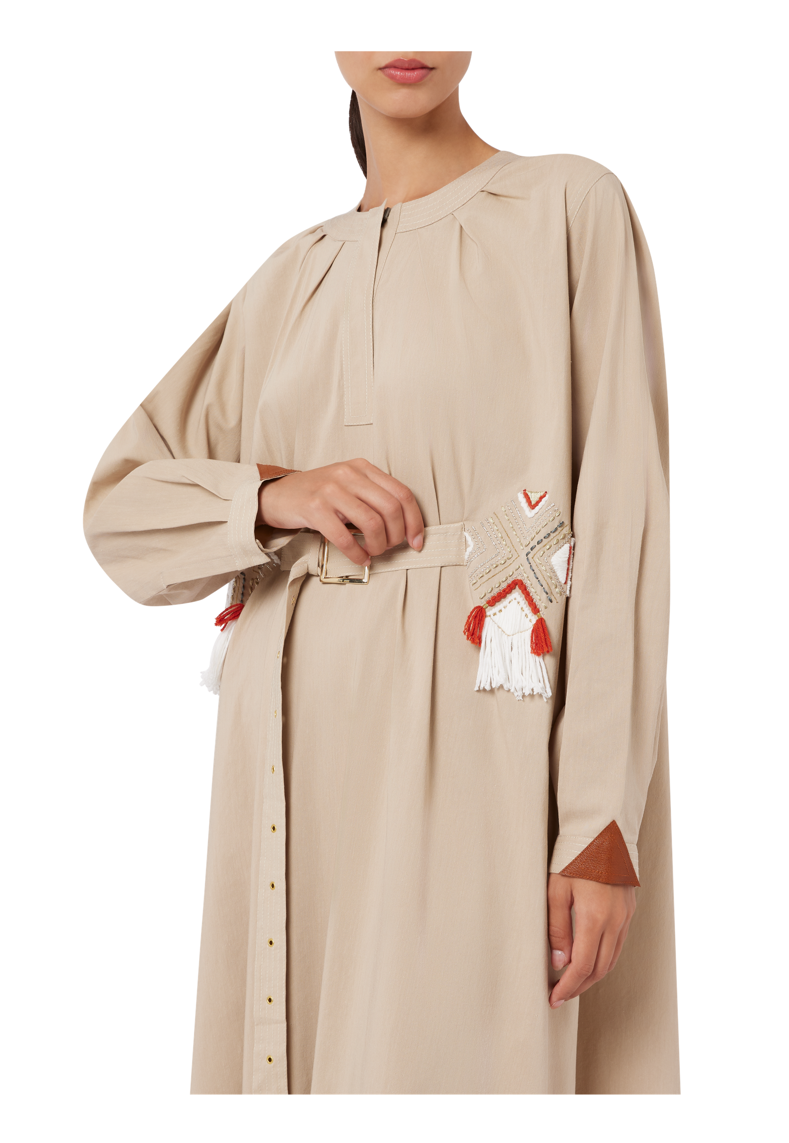 Presenting The Overcoming long dress: A long dress handcrafted with alluring embroidery adorning either side of the twist-tie belt (with a durable golden buckle) and intricately sewn beads to create a mesmerizing airy pattern. Made from luxurious cotton, viscose and linen, coupled with a thoroughly pleated neck and cuff sleeves (with genuine leather pieces) that marry to create a stunning, versatile piece for the free-spirited and fashion-forward ladies of the world, while still embodying an airy charm and stately modesty.