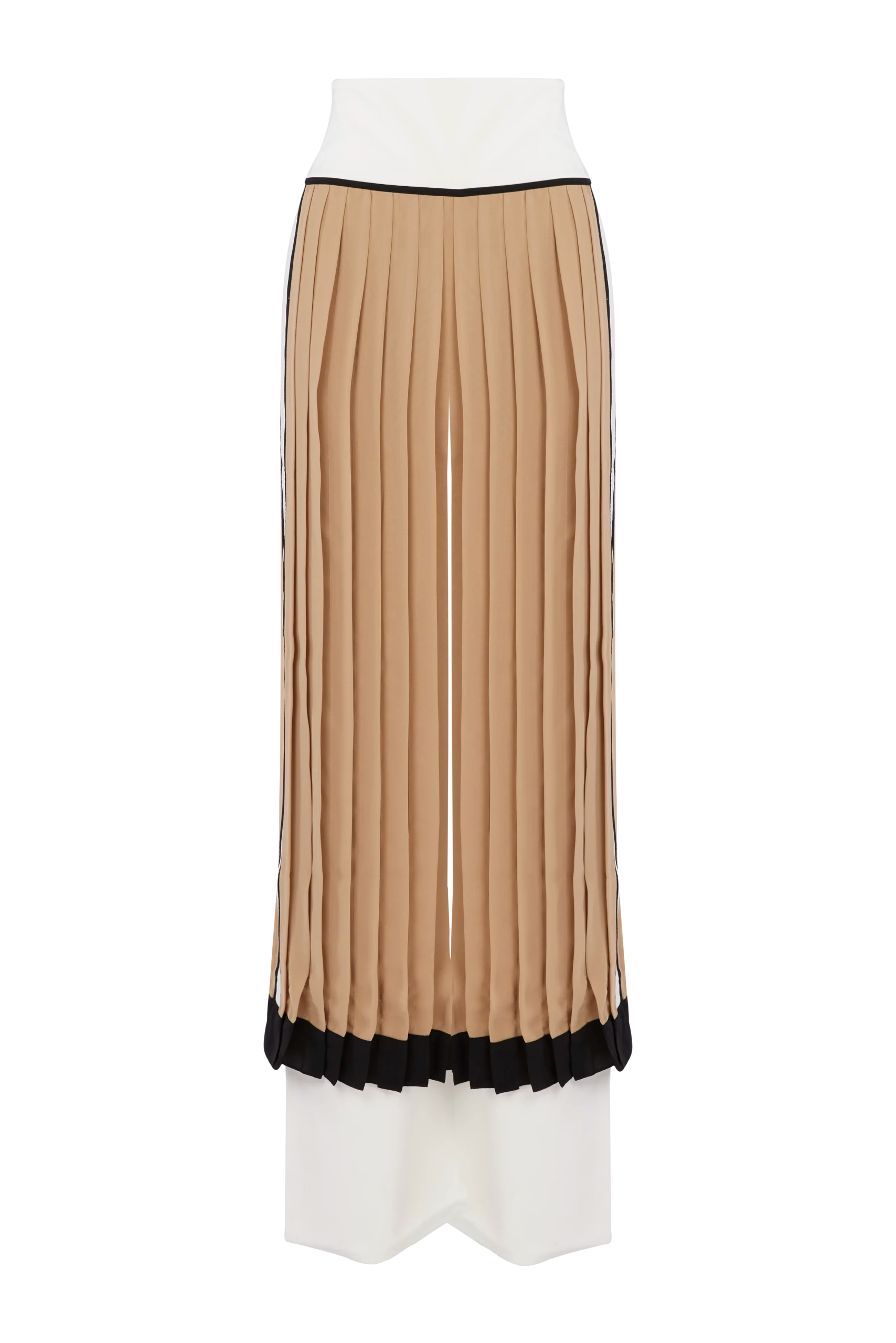 Complementing the Pursuit Open Style shirt, these high-waisted pants are a testament to modest fashion wreathed in a sophisticated and international taste. Beginning with off-white around the waist, they flow into pleats that utilize hand-pleating – a process which takes days to ensure that the design always retains its integrity— that fall graciously below the knees and end in jet black borders, beyond which, the off-white oasis again appears until the ankles.
