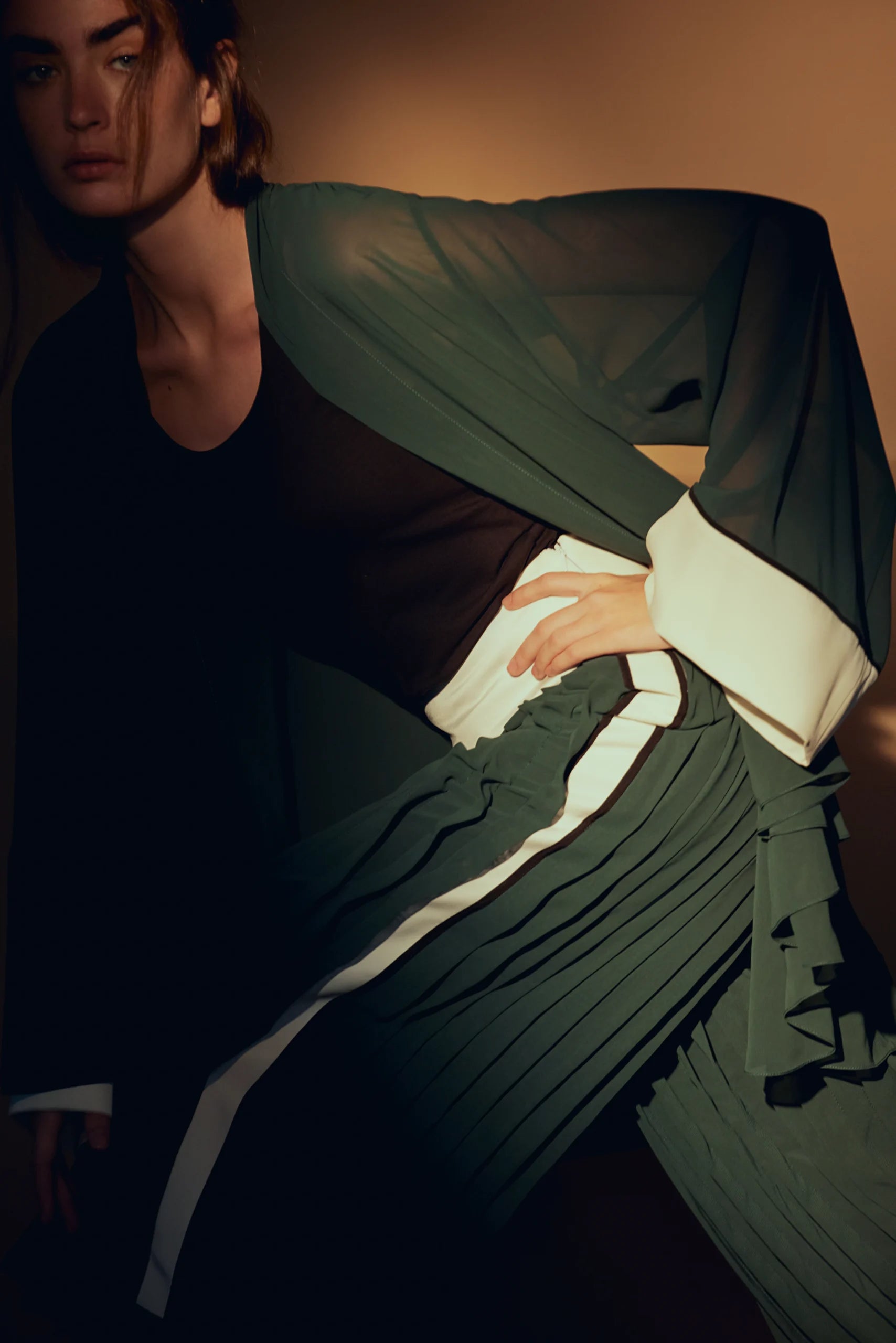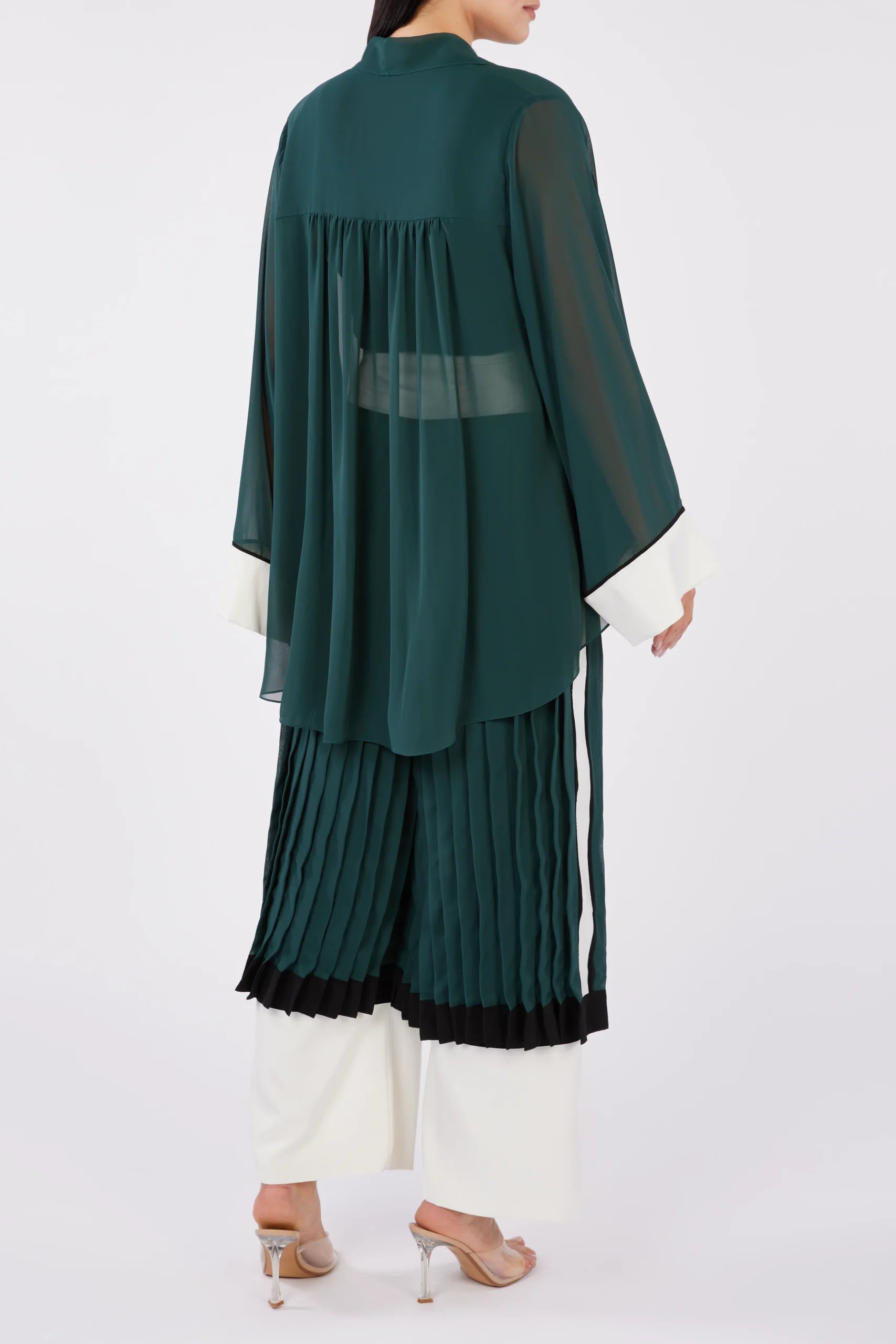 A relaxed sheer open style shirt attempting to tell a tale of graceful ascension, The Pursuit Open Style Shirt utilizes rich chiffon and elegant gathers on the back, to drape your body. The fabric flows down onto your arms to an oasis of contrasted cuffed sleeves that envelop your wrist. Destined to be fawned over, it’s designed to ensure a smooth flow of movement, and a gracefully modish style that doesn’t sacrifice practicality.